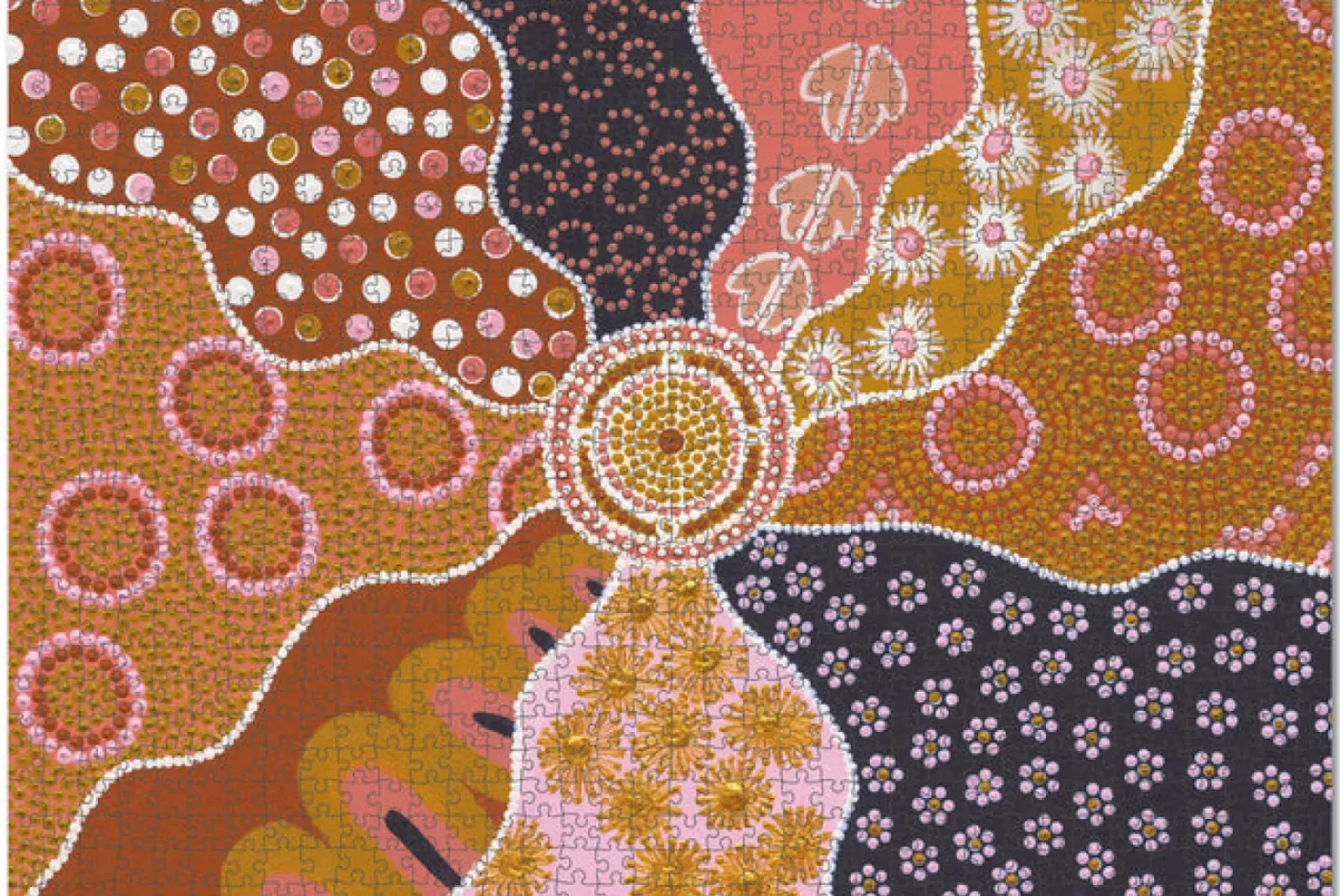 “Desert Flower” is a unique 1000 Piece Australian puzzle and includes Kangaroo footprints, birthing caves and two beautiful native Australian flowers; The eucalyptus flower and the Acacia pycnantha – commonly known as the Golden Wattle.
