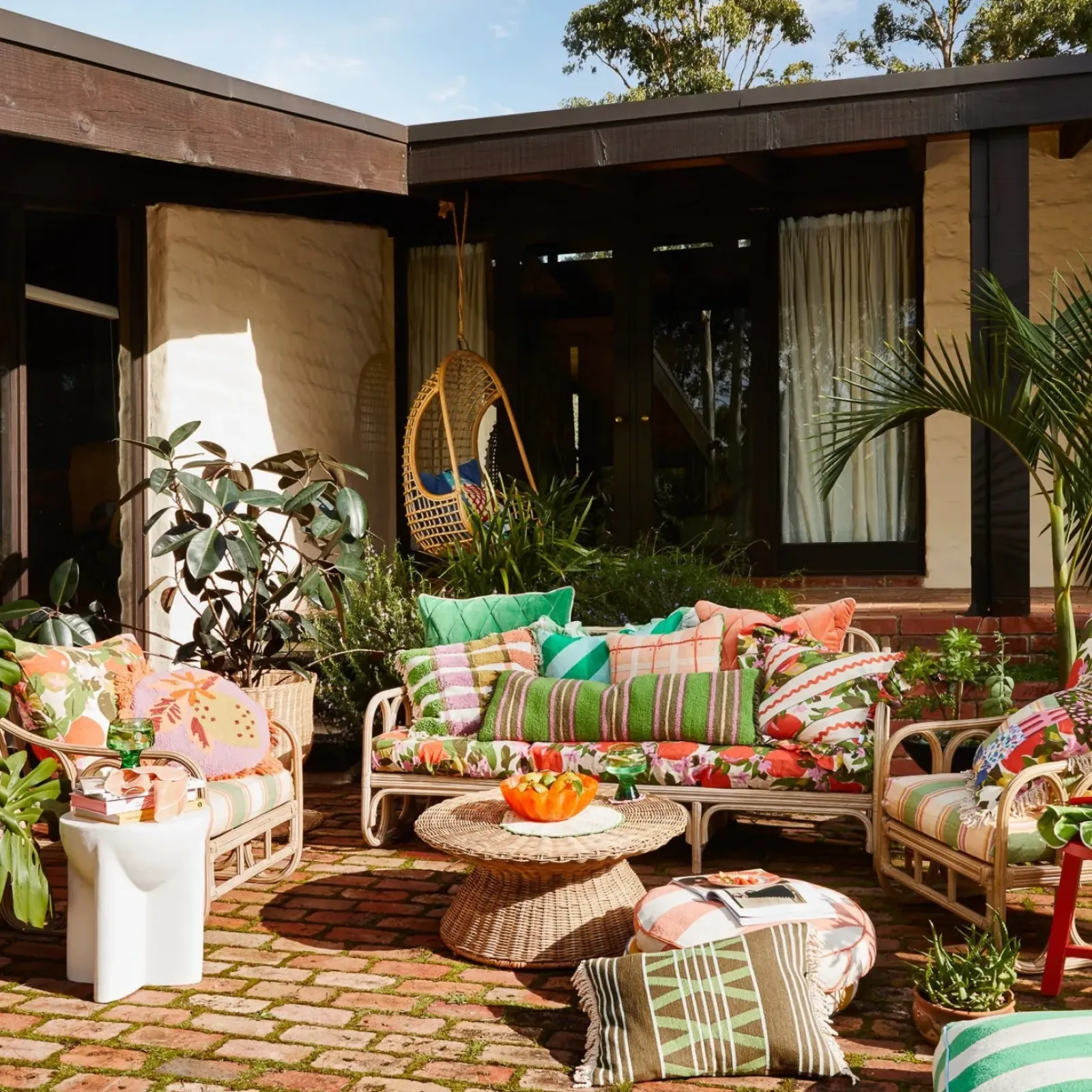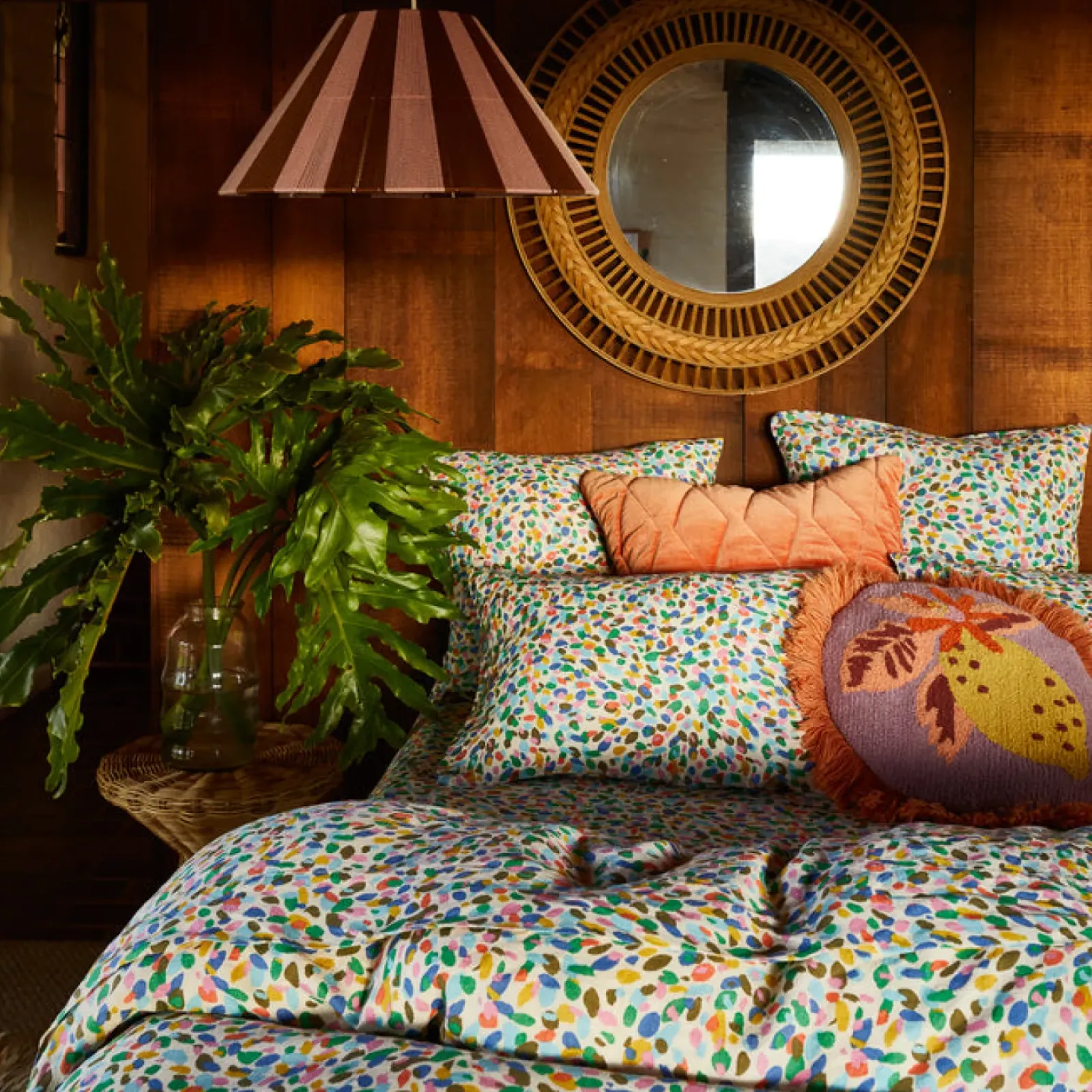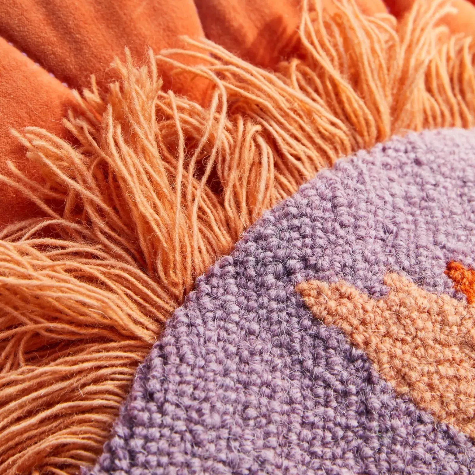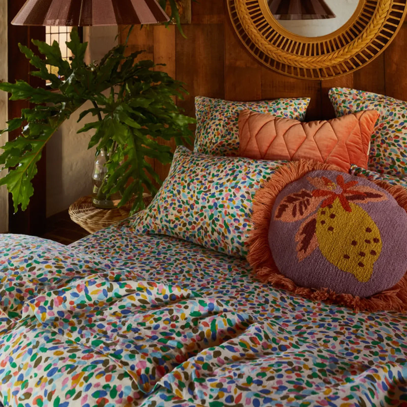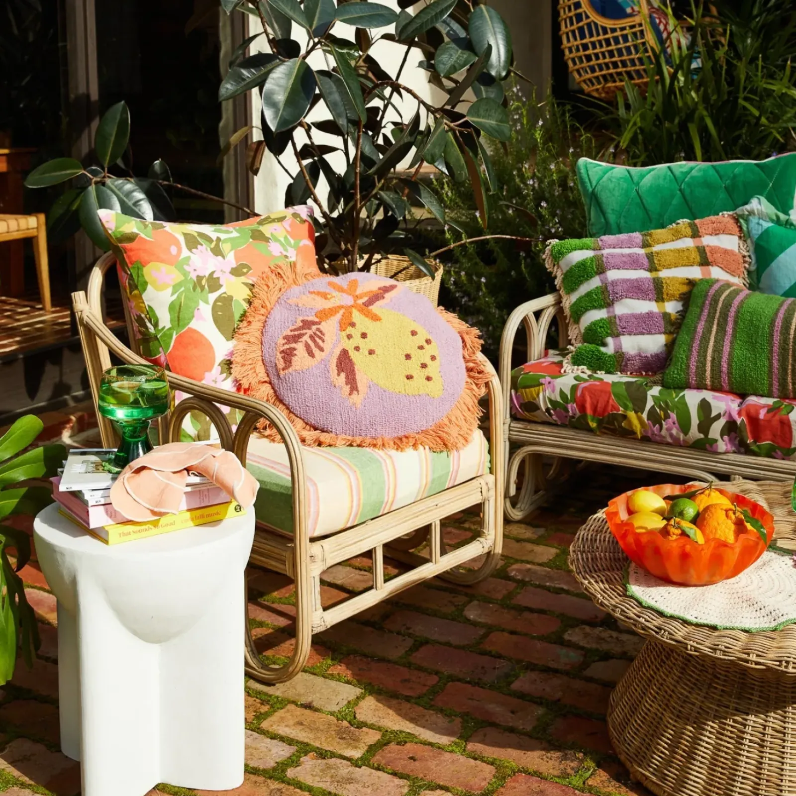 “Expert craftsmanship shines in this round cushion, designed for touchable texture. Every single loop is crafted by hand using meticulous punch needle techniques, creating a timeless centrepiece to bring any interior to life. Vibrant tonal shades, veggie garden motifs and long fringe edging all come together in a playful ode to the summer harvest.” – Phoebe’s Style Notes
