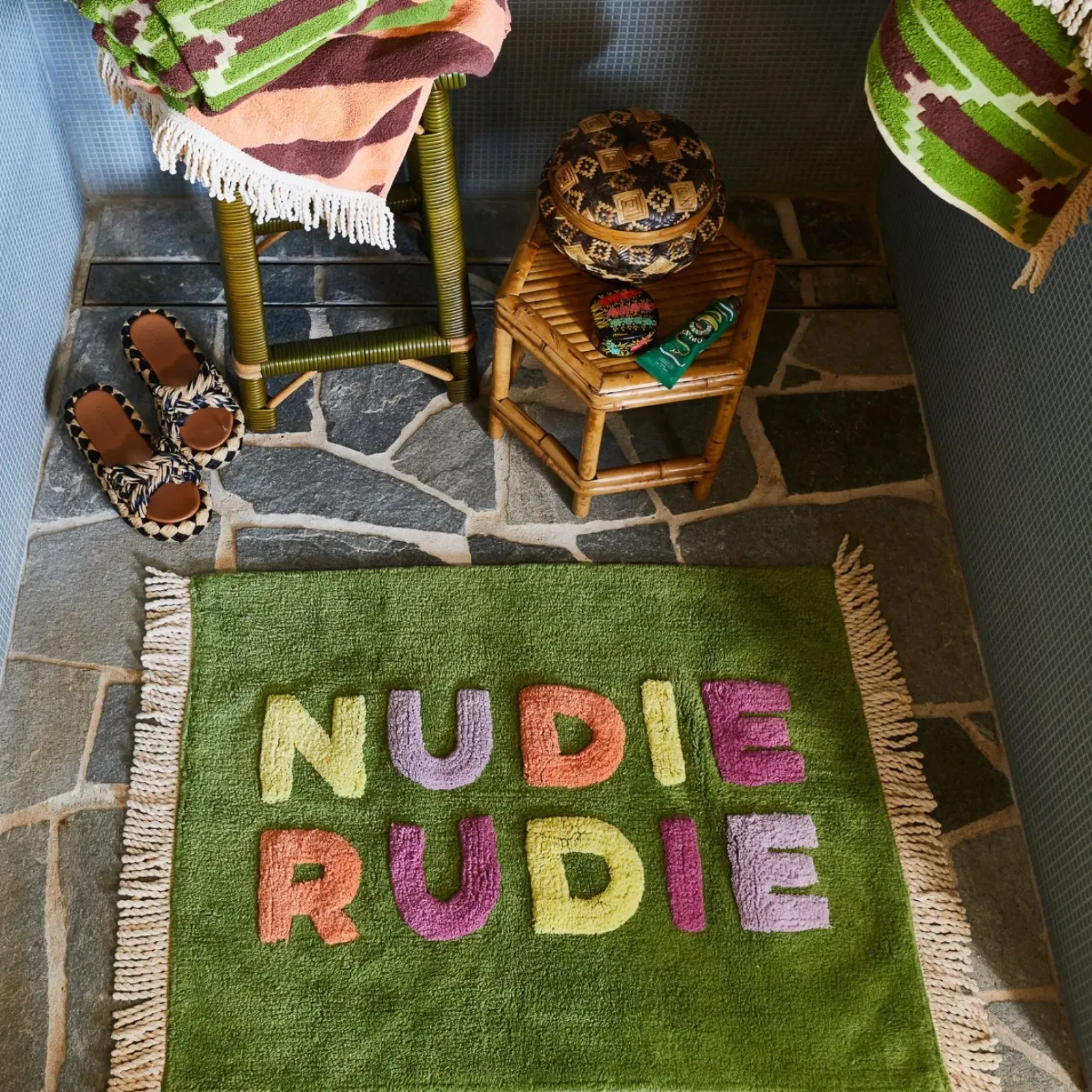 Plant your feet each morning on our incredibly plush, super absorbent, Nudie Rudie bath mat and start every day with a cheeky giggle. Handmade by 10 different artisans, our Nudie Rudie bath mats are super special and iconically Sage x Clare.
