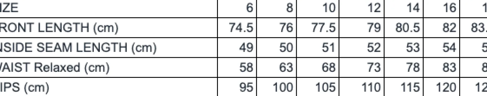 Length: 76cm Inside Leg: 51cm, Front Rise: 21.1cm, Leg Opening 28.4cm (size 8). Our model is 170cm tall with an 86cm bust, 66cm waist and 86cm hips.