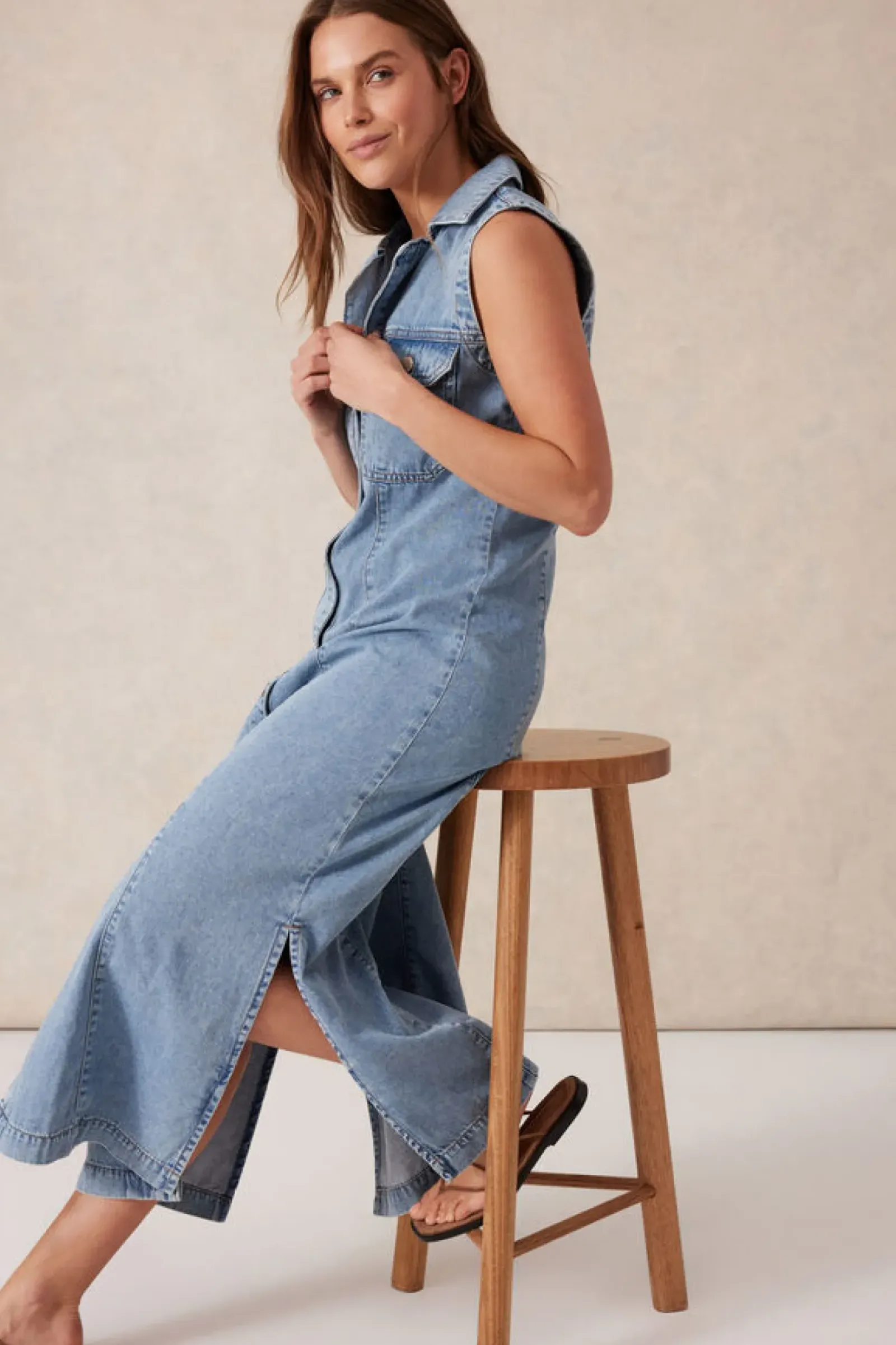 Say hello to style with our Sleeveless Panelled Midi Shirt Dress. Crafted from rescued cotton twill, featuring fit and flare styling, long midi length with side splits, and functional button-through front making it perfect for any occasion. Pair with your favourite sandals and you’re ready for Summer.