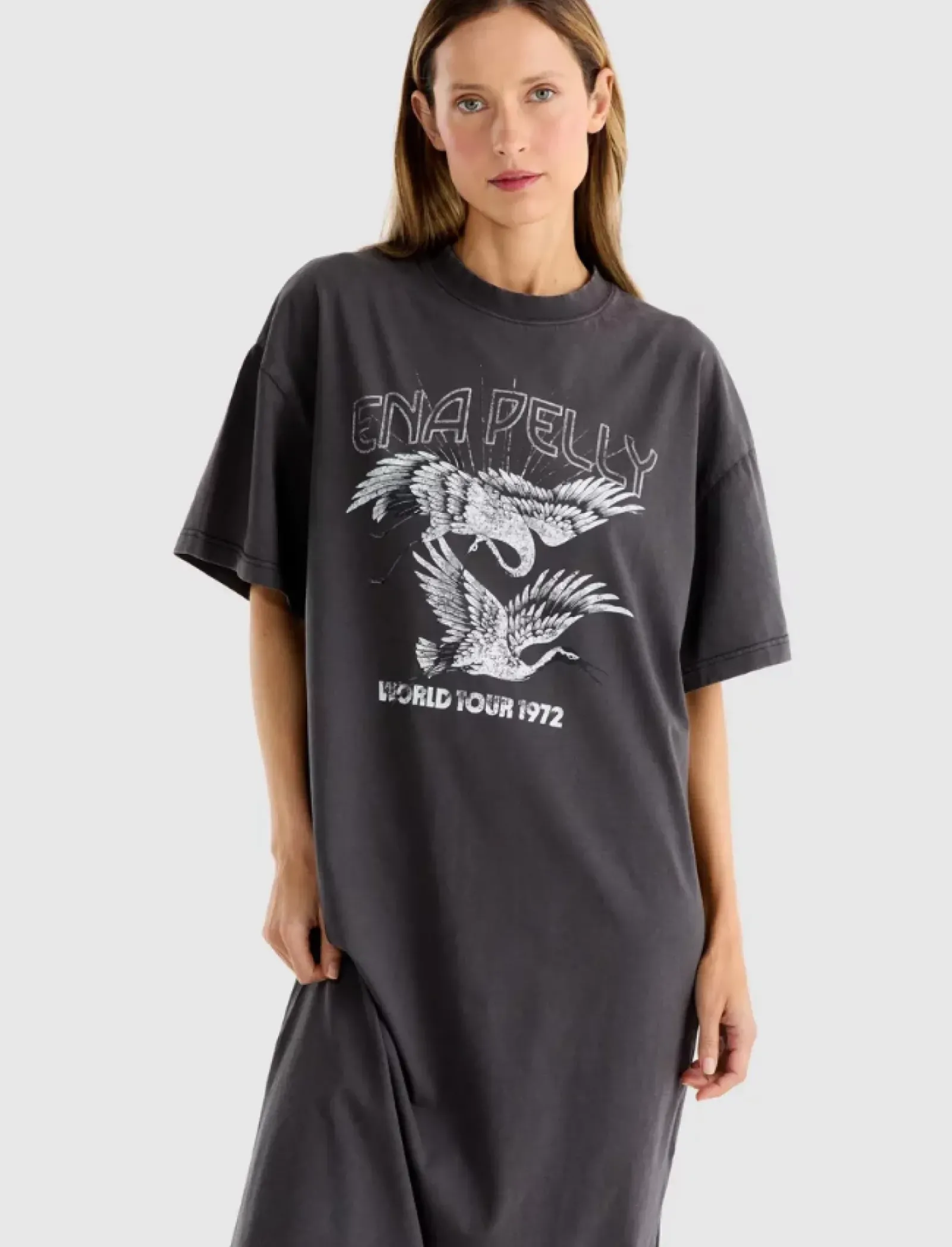 The World Tour Tee Dress in Faded Black is crafted from soft cotton jersey with an oversized fit and maxi length. Featuring exclusive in-house graphics and a special garment wash, no two pieces are the same. Style it with chunky boots for an edgy, streetwear vibe.