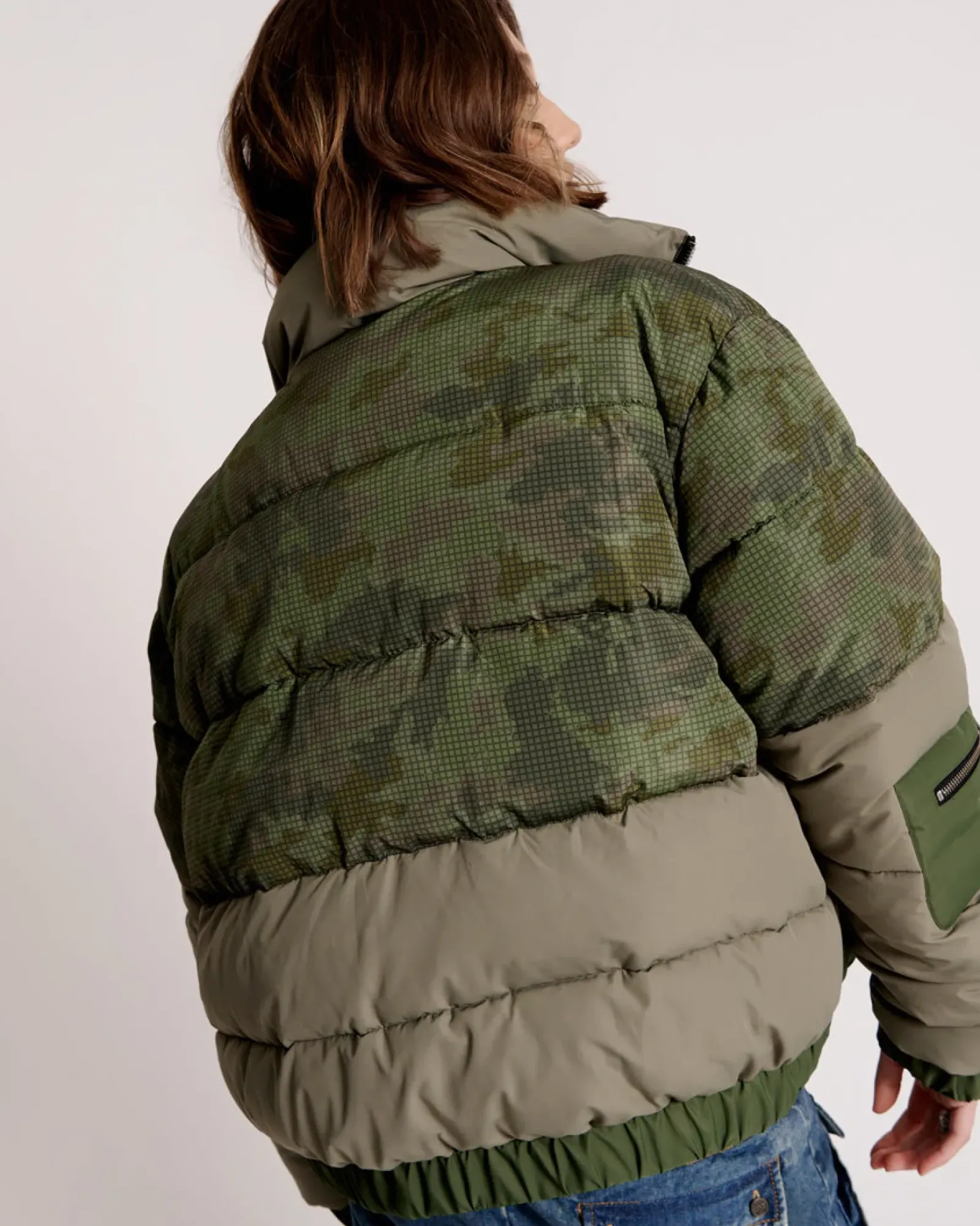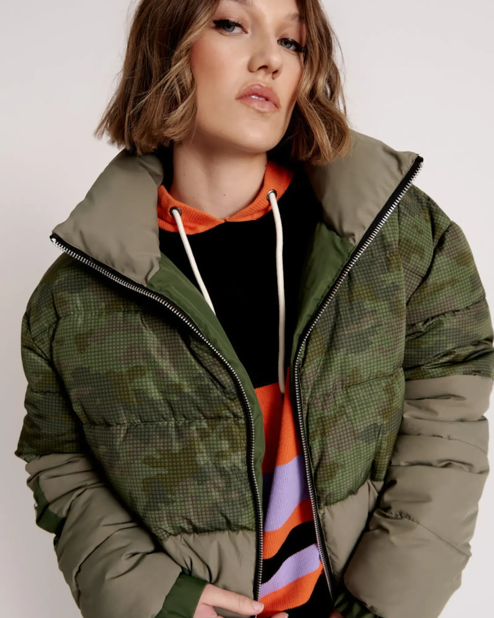 The DIRTEE LOVE PUFFA JACKET – the ultimate stylised puffer coat. Khaki camo print with a sport-luxe new One Teaspoon logo print. Features a front zip, rope zip pull, double pocketing, back of neck rouching & a comfy, warm elasticated waist. Super stuffed & super warm.