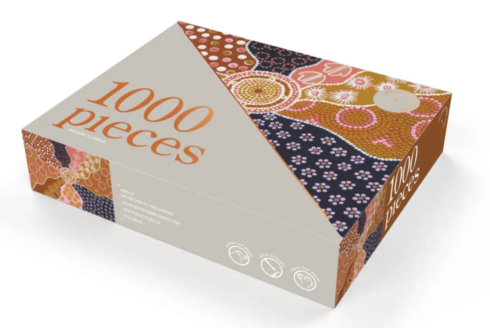 “Desert Flower” is a unique 1000 Piece Australian puzzle and includes Kangaroo footprints, birthing caves and two beautiful native Australian flowers; The eucalyptus flower and the Acacia pycnantha – commonly known as the Golden Wattle.