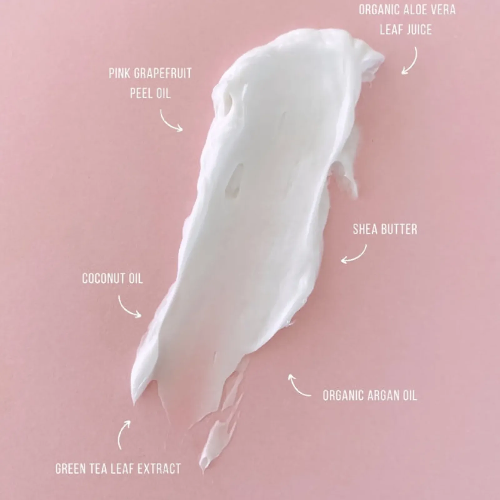 - Ingredients: Water (Aqua), Aloe barbadensis (Organic Aloe vera) leaf juice, Glycerin*, Cocos nucifera (Coconut) oil, Caprylic/Capric triglyceride*, Cetearyl alcohol*, Stearic acid*, Ceteareth-20*, Butyrum parkii (Shea) butter, Argania spinosa (Organic Argan) kernel oil, Squalane*, Camellia oleifera (Camellia) seed oil, Camellia sinensis (Green tea) leaf extract, Tocopherol* (Vitamin E), Panthenol (Vitamin B5), Citrus paradisi (Pink grapefruit) peel oil, Carrageenan, Fragrance*, Ethylhexylglycerin, Phenoxyethanol, Sodium hydroxide. *Derived from plant