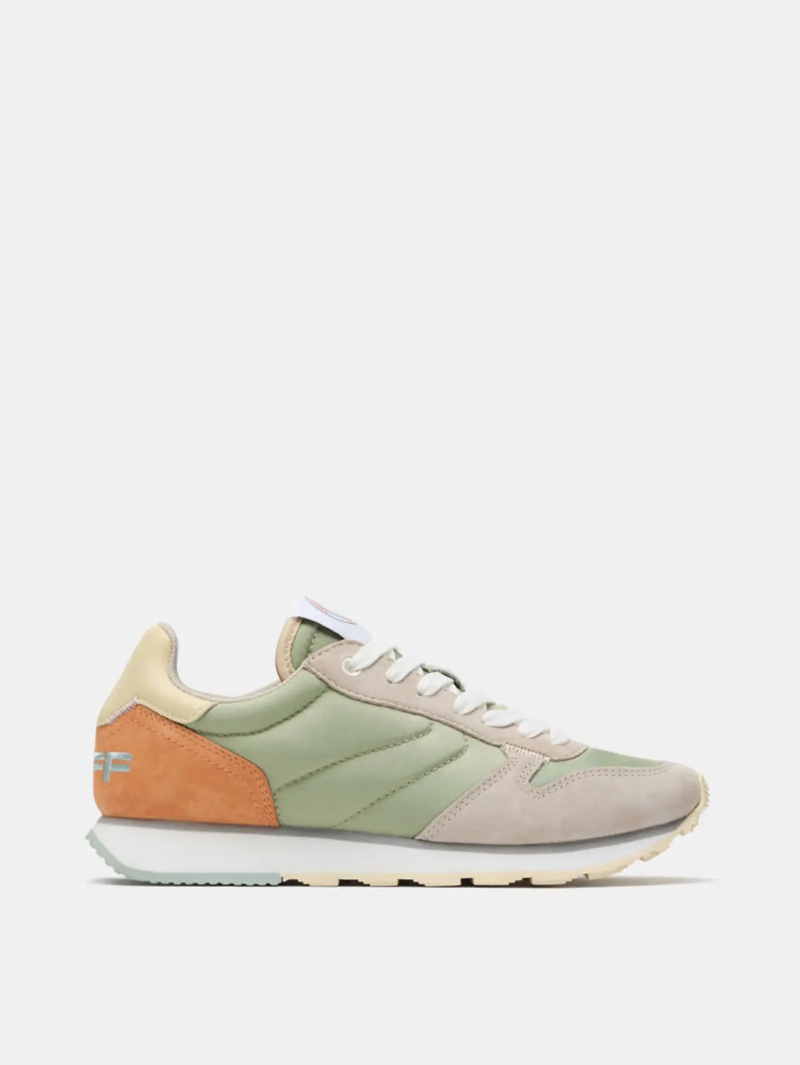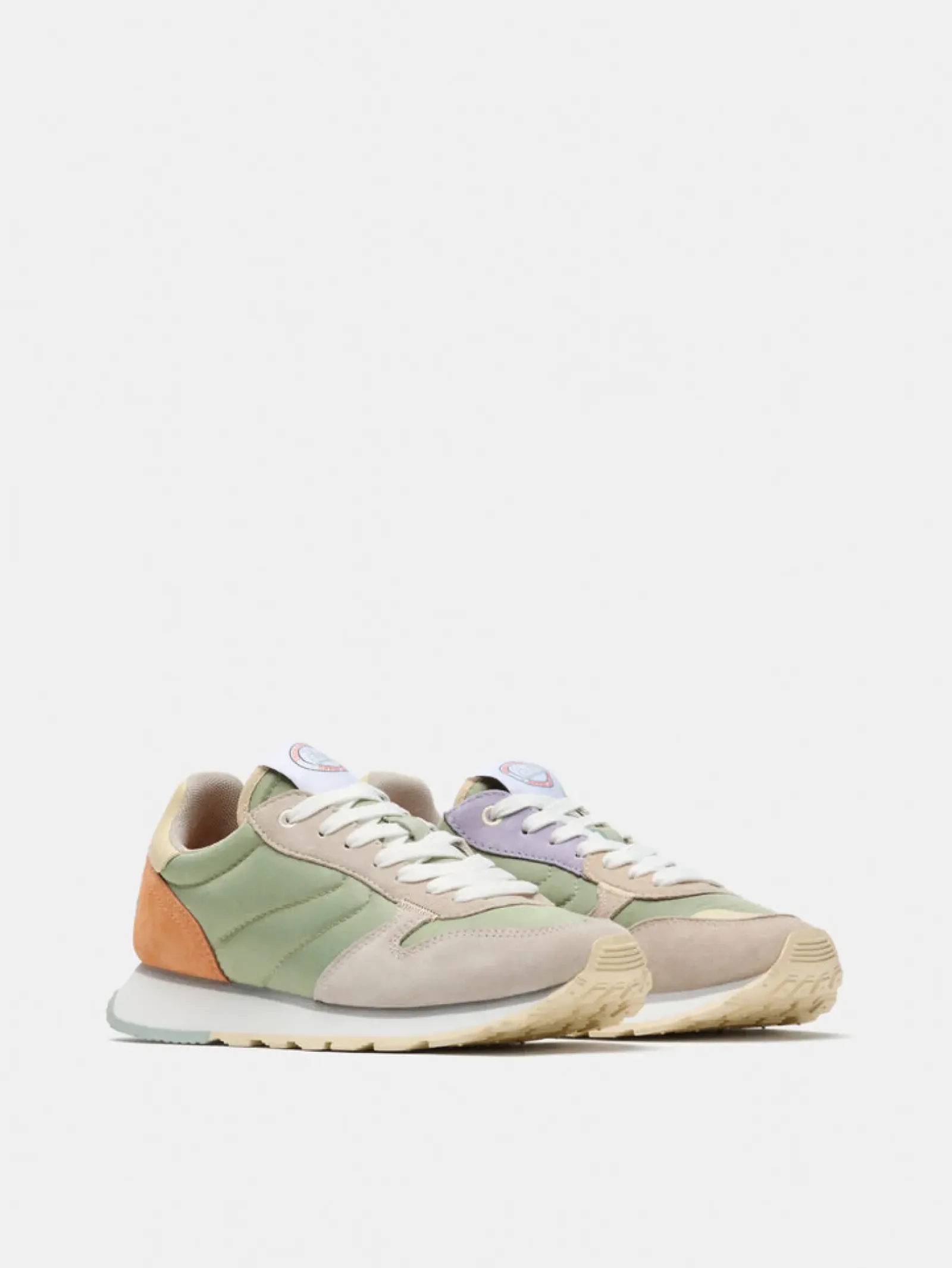 For lovers of retro and vintage style, the DELPHI in water green nylon with asymmetrical details in lilac and orange suede are the perfect blend to stand out anywhere. The mouse-gray suede at the front and the pastel yellow leather bring a premium touch. The waffle-designed sole in aquamarine and soft yellow, along with the embossed logo, is the cherry on top. Their lightness and comfort are guaranteed thanks to the memory-foam insole. They are perfect to pair with classic jeans and your favorite t-shirt.