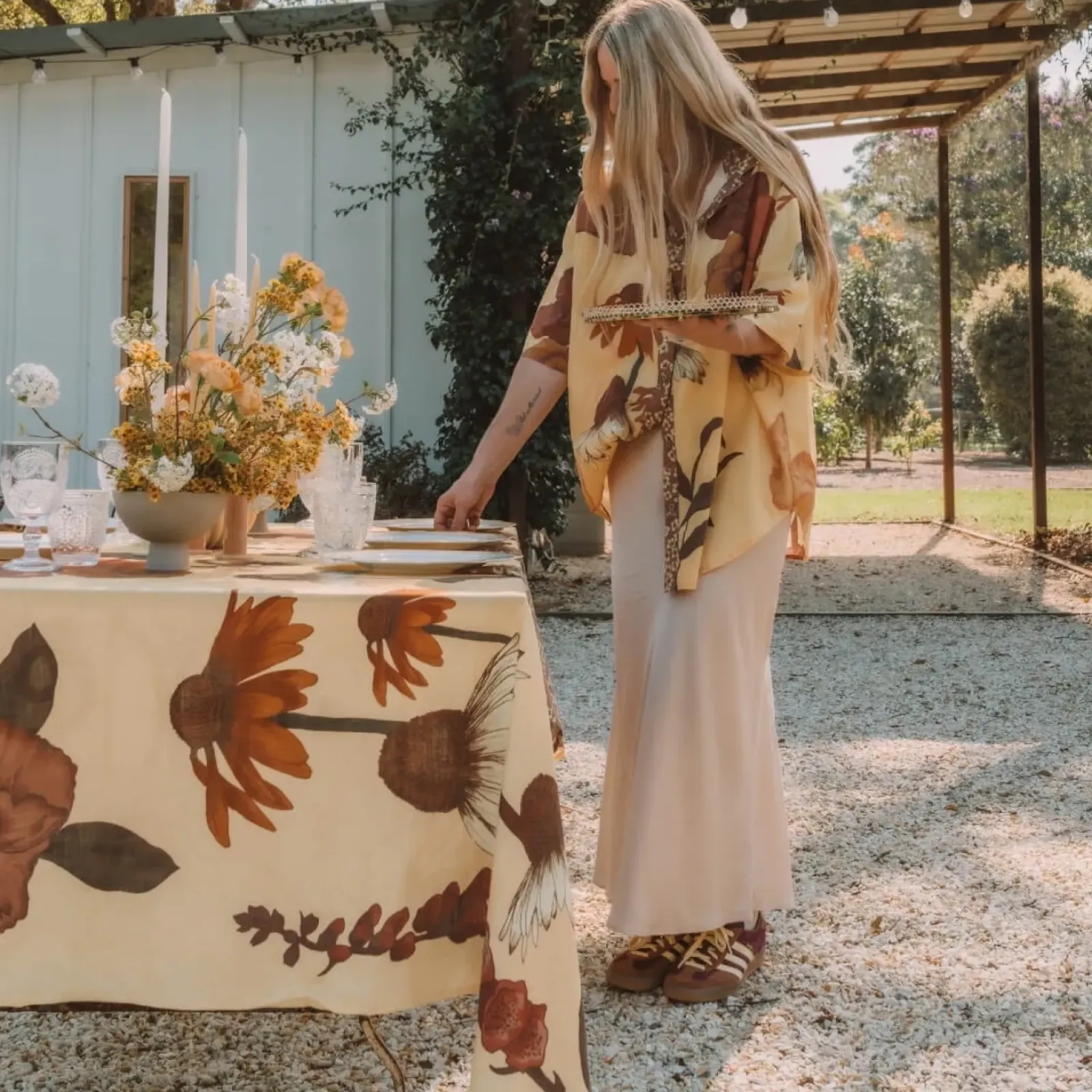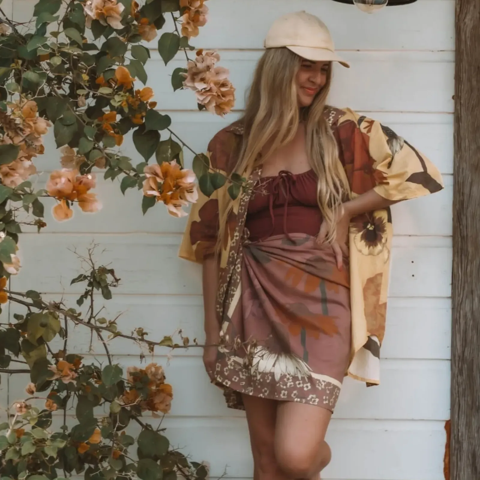 Introducing a new piece to our beach collection for this summer! A stylish and light weight breezy over swim shirt made from an organic cotton voile, a semi sheer fabric with an all over large floral print featuring a contrast placket in in a brown ditsy print, finished with buttons up the front. It’s a ONE SIZE over swim shirt, that fits a size 6-8 to a size 16 with a different look on each size.